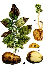 1 - пораженный лист; 2 - пораженные ростки; 3 - пораженные глазки; 4 - слева пораженный клубень, справа то же в разрезе.
