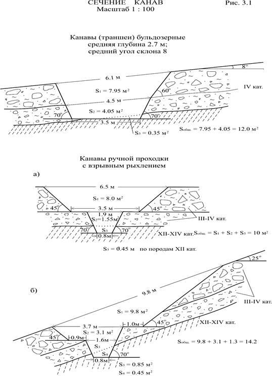 Механическая проходка канав будет осуществляться бульдозерами Т-170 без предварительного рыхления пород. В связи с незначительной сезонной оттайкой мерзлоты предусматривается 2-х и 3-х кратный заезд техники на канавы, а в ряде случаев и добивка их ручным способом с применением взрывчатых материалов. При ширине отвала бульдозера 3,25 м ширина канавы по полотну составит 3,5 м. Мощность вскрываемых наносов от 1,5 до 5,0 м при средней 3,0 м. Длина канав 40-150 м, в среднем 60 м. Сечение на 1 п. м 12 м3