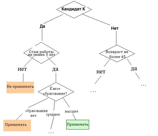 Рассмотрим вышесказанное на примере дерева классификации, с помощью которого решается задача "Принять на работу гражданина К?". Она является типичной задачей классификации, и при помощи деревьев решений получают достаточно хорошие варианты ее решения.
