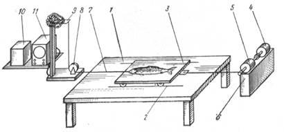 Один конец нити закреплен к тележке, а другой к шкиву. Гибкая нить наматывается на шкив и перемещает тележку. На тележку укладывают исследуемый материал, с которым кон тактирует рыба.