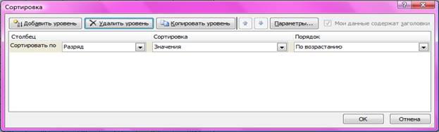 Параметры сортировки задают командой Данные > Сортировка. При этом открывается диалоговое окно Сортировка диапазона. В нем можно выбрать от одного до трех полей сортировки, а также задать порядок сортировки по каждому полю.