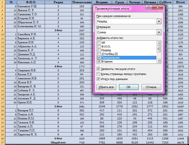 - данные по разряду, Ф.И.О., понедельнику, среде, субботе сборщиков;