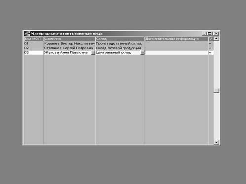 4. Ввели материально-ответственных лиц по складам, выбирая из каталога сотрудников предприятия