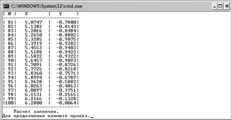 dx=6,28/99 т.к. 99 шагов между точками таблицы. Пример выполнения программы выглядит так: