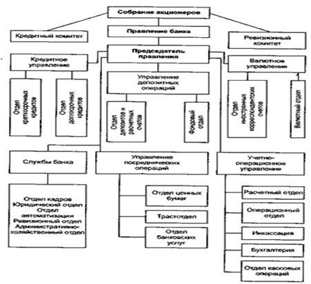 Организационная структура банка представлена на рисунке 1. Функциональные подразделения – это юридический отдел, отдел кадров, административно-хозяйственный отдел и т.д. Все они обеспечивают нормальное функционирование руководства.