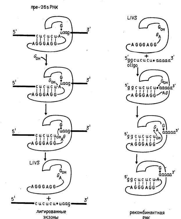 Получение рекомбинантных РНК с помощью рибозимов основано на обратимости реакции самосплайсинга (при отсутствии гуанозина или гуаниловых нуклеотидов). Это предоставляет возможность для встраивания интронной РНК в заданный участок другого сегмента РНК (рис. 3). Фрагмент РНК, в который производится встраивание, должен содержать нуклеотидную последовательность, идентичную нуклеотидной последовательности 3'-концевого участка 5'-экзонного района 26S РНК и соответственно комплементарную той нуклеотидной последовательности в интроне, которая отвечает за специфичность прямой реакции. Фрагмент, в который производится встраивание, берется в избытке.