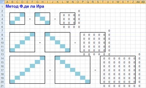 В ходе экспериментальной части по методу Ф.де ла Ира , мы заметили, что в первых двух квадратах, элементы на ломаных диагоналях равны, и пришли в выводу, что процесс заполнения этих квадратов можно также автоматизировать. Достаточно указать только по одному элементу на каждой из ломаной диагонали.