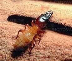 Воины различаются по своему строению. У обыкновенных солдат очень большая бронированная голова с сильно развитыми длинными жвалами. Выглядят они словно в касках. А задняя часть тела мягкая. Своей большой головой солдат закрывает почти весь проход в термитнике. Наклонит голову, раздвинет жвалы - и готов отразить атаку противника. При нападении он выбрасывает голову вперед и резко сжимает жвалы, перерубая ими все на своем пути. Вот почему муравьи, с которыми часто воюют термиты, знают оборонительную мощь обыкновенных солдат и стараются нападать на них с тыла, где тело гвардейцев мягко и беззащитно. Среди обыкновенных солдат различают больших, средних и малых. Большие солдаты обязаны защищать термитник от внешних врагов, средние несут тыловую службу, а малые - это полиция. Полицейские разгуливают среди рабочих, следят за порядком, наказывая медлительных рабочих частыми ударами своей склеротизированной головы по спине.