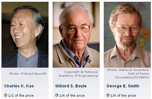 Нобелевская премия по физике за 2009 год была присуждена китайцу Чарльзу Као и американцам Уилларду Бойлу и Джорджу Смиту за исследования в области информационных технологий. Као стоял у истоков оптоволоконной технологии передачи данных, а Бойл и Смит изобрели полупроводниковое устройство, позволяющее напрямую, минуя фотопленку, получать цифровые фотографии. Их работы привели к настоящей революции сначала в прикладной науке, затем в наукоемких технологиях, а в последнее десятилетие они прочно вошли в нашу повседневную жизнь, сделав ее намного более комфортной. Достаточно представить себе, как выглядел бы мобильный телефон с пленочной, а не цифровой фотокамерой!