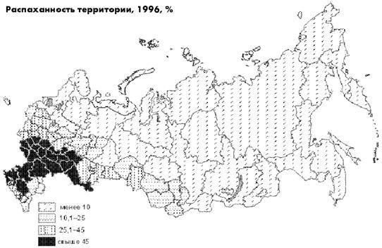 Россия располагает огромной площадью земель – 1708 млн. га. Но значительная ее часть приходится на тундру, тайгу, горные массивы. Только 222 млн. га (13%) составляют сельскохозяйственные угодья, т.е. земли, используемые в сельском хозяйстве. Доля же самых ценных земель (пашни) еще меньше – 8% (132 млн. га). Однако в расчете на душу населения по сравнению с другими развитыми странами мира российские показатели достаточно велики.