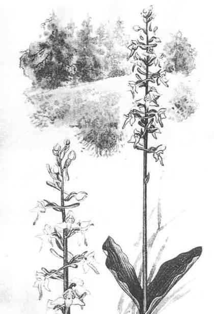 Ночная фиалка, кукушница двулистная, бальзамин дикий, ночные духи, полевой жасмин, ночная красавица — все эти названия принадлежат любке двулистной. И если любка неприметна в дневное время, то вечером и ночью она поистине царствует, так как её удивительный нежный запах наполняет июньский лес. На этот чарующий аромат и светящуюся при лунном свете белизну цветков слетаются бабочки. Причём «присесть» на цветок они не могут, поскольку у него нет приспособлений для того, чтобы удерживать насекомых. Поэтому бабочки лакомятся нектаром на лету. В основании стебель растения охвачен широкими черешками 2 крупных светло-зелёных удлинённо-овальных листьев, почти лежащих на земле, с блестящей, словно лакированной, поверхностью. Корни в виде 2 клубней: один — сморщенный, старый; другой — поменьше и светлее, молодой, в нём накапливаются запасные вещества для развития побегов следующего года. В старину клубни этой орхидеи считались приворотным зельем, отсюда название «любка». Стебель любки увенчан кистью белоснежных цветков, напоминающих изящных бабочек. Лепестки плотные и сочные, словно фарфоровые; три из них сложены шлемом, два отогнуты в сторону, а один свисает губой, у основания которой длинный и тонкий шпорец, заострённый на конце. Размножается любка вегетативно и семенами. Зацветает на 6—8-й год жизни.
