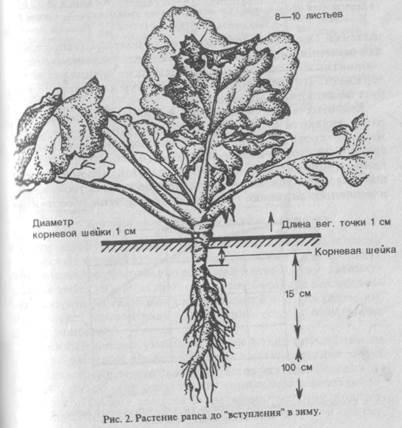 Мощная корневая система рапса служит не только для снабжения растения питательными веществами и водой. В корнях, что особенно важно для зимовки, накапливаются питательные вещества. Они являются своеобразной кладовой растения. Образование мощного корня способствует лучшей зимостойкости. Наибольшая гибель растений наблюдается в конце зимы, когда сходит снежный покров и иссякают накопленные в корнях запасы питательных веществ. Слабая питательная база является причиной гибели растений и весной, при низких колебаниях дневных и ночных температур.