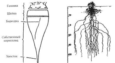 состоит из главного корня, боковых корней и корневых волосков. Мочковатая корневая система, которая имеет решающее значение для поглощения воды и питательных элементов, находится на глубине почвы до 25 см. К концу вегетации в этом слое сосредоточено до 60-80% этих корней, глубже 1,5 м - примерно 10% (рис. 3). Корни весной сначала медленно развиваются, однако ко времени смыкания рядков они уже достигают общей длины 10- 15 м/м2