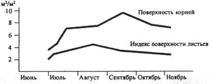 Поверхность корней как мера способности поглощения питательных веществ и воды достигает во время вегетации почти двойного размера индекса листовой поверхности (рис. 13).