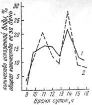 Так же неравномерно расходуют влагу растения свеклы в течение дня (рис. 5) . Первого максимума транспирация достигает к 11 ч. Затем с II до 15 ч испарение резко уменьшается. После этого транспирация вновь возрастает и к 14 ч достигает второго максимума, более выраженного по сравнению с первым. Характерно, что у сортов урожайного направления в течение дня более равномерный расход воды на испарение, менее выражены максимум и минимум транспирации в течение дня, чем у сортов сахаристого направления.