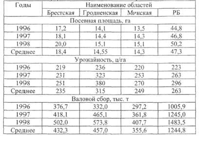 Начиная с 1992 г. данная культура выращивается в Витебской, Гомельской и Могилевской областях, где она занимает незначительные площади: с 1992 по 1998 г. в хозяйствах всех категорий этот показатель колебался от 0.1 до 1.0 тыс. га. В то же время нестабильны размеры посевных площадей в областях традиционного свеклосеяния (Брестской, Гродненской, Минской): с 1991 по 1994 г. они расширялись, а с 1994 по 1996 сокращались. В целом по республике посевы сахарной свеклы уменьшились с 57.6 тыс. га в 1994 г. до 44.8 тыс. га в 1996 г. и в 1998 г. посевные площади составили 50.2 тыс. га.