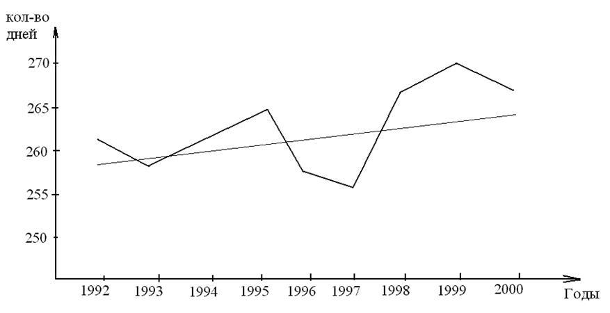 Получается так: чем больше дней в году работник отрабатывает, тем меньше производительность труда, т.е. выход на работу ещё не означает продуктивный труд. Здесь могут быть различные причины: и короткий рабочий день (не 7-8 часов, а 5-6), и нежелание работать (в следствие низкой заработной платы, несоответствующих нормам условий труда и др.), и отсутствие средств или предметов труда и т.д.