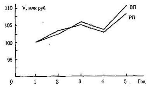 Из таблицы видно, что за пять лет объем производства возрос на 12 %, а объем реализации - на 7,9 %. Если за предыдущие годы темпы роста производства и реализации примерно совпадали, то за последний год темпы роста производства значительно выше темпов реализации продукции, что свидетельствует о накоплении остатков нереализованной продукции на складах предприятия и неоплаченной покупателями.