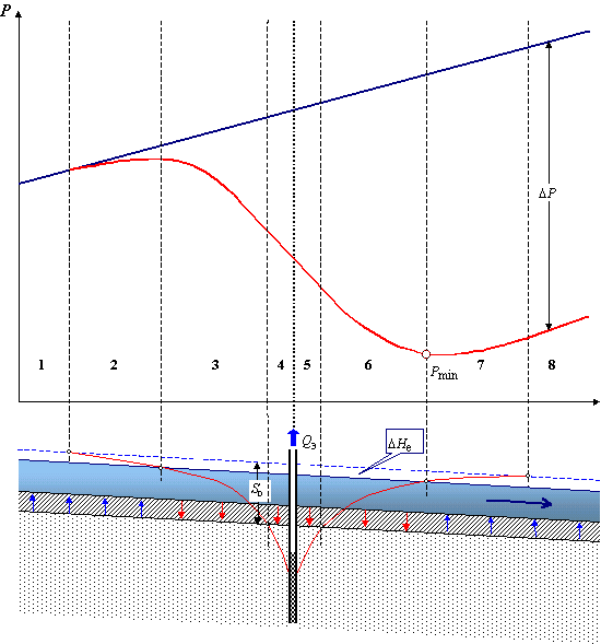 7 - в гидродинамическом смысле зеркально повторяет зону 2; ущерб стоку еще возрастает, но с затуханием интенсивности; расход реки постепенно начинает увеличиваться за счет частично восстанавливающегося подземного питания