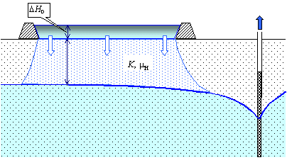 Создание искусственных запасов (применяется также термин "магазинирование") производится один или несколько раз в году путем единовременного затопления больших площадей вблизи водозаборного сооружения (естественные понижения, специально обвалованные участки пойм, террас...); обычно предварительно производится зачистка слабопроницаемого почвенно-растительного слоя. Полное насыщение пород в зоне аэрации над депрессионной воронкой (рис.6.7) происходит достаточно быстро: