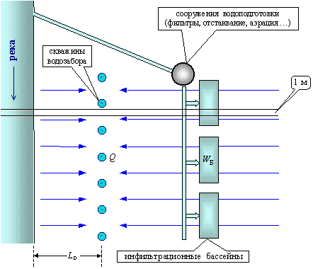Характерная схема водозаборного сооружения - линейный ряд скважин вдоль реки с параллельной системой инфильтрационных бассейнов. Если рассматривать линейную структуру потока (по ленте тока шириной 1 м - рис.6.8), то