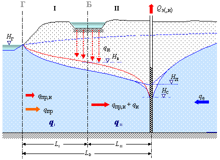 Можно уверенно считать, что при подъеме уровней под бассейном величина естественного расхода практически не изменится, так как область питания находится достаточно далеко и относительно небольшое повышение уровней не повлияет на величину инфильтрационного питания. Величина привлечения из реки тоже не изменится ( ), так как сохраняются отметки Hг и Hс (Hл). Поэтому при наличии ИПЗ: