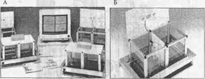 Голубей и крыс обучают выбору по образцу в камере Скиннера (см. рис. 3.6). На диск, расположенный в центре, проецируется образец, на боковые диски — стимулы для сравнения. В качестве стимулов используется, как правило, подсвет дисков разными цветами. Животное осуществляет выбор путем клевания одного из боковых дисков (голубь) или нажатия на него мордой или лапой (крыса).