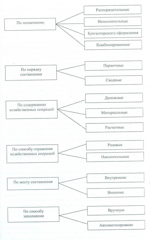 Для выбора наиболее рациональных форм, видов при оформлении тех или иных операций все документы классифицируют (группируют) по нескольким признакам: