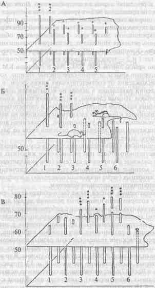 Рисунок 1А показывает успешность решения данного теста лисицами обеих групп. Доля правильных решений (на рисунке — высота столбиков) была выше у диких (1) лисиц, по сравнению с одомашненными (2—5). Очень высокий уровень правильных решений теста на экстраполяцию (даже при его первом предъявлении) наблюдали у прирученных диких крыс-пасюков, хотя эти показатели быстро снижались уже в течение первого опытного дня (т.е. при 6—8 предъявлениях теста). Лабораторные же крысы (линии Крушинского—Молодкиной (KM), Wag, August и их гибриды между собой) оказались вообще неспособными к решению задачи на экстраполяцию. Доля правильных решений у них не превышала 50%-го уровня, т.е. они выбирали направление обхода ширмы чисто случайно, не руководствуясь информацией о направлении перемещения корма. В то же время гибриды первого поколения от скрещивания диких крыс с лабораторными обнаружили высокий уровень решения этой задачи, достоверно превышающий случайный уровень (Крушинский, 1986). Эти соотношения можно видеть на рис. 1 Б, где 1 и 2 — показатели диких крыс и их гибридов, 3—6 — соответственно крысы линий KM, WAG, Aug и гибридов KM x Aug.