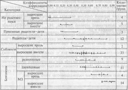 Приведем только один пример из этой области (табл. 1), который показывает, что величины коэффициентов корреляции между показателями ряда психологических тестов на «интеллект» у людей с разной степенью родства сильно различаются. Горизонтальные линии в столбце «Коэффициенты корреляции» располагаются под величинами этих индексов, полученных в разных исследованиях. Таким образом, длина такой линии характеризует разброс данных, полученных в разных работах для определенной категории родственников. Как мы видим, степень сходства в показателях этих тестов наиболее высока у монозиготных близнецов даже в случаях, когда они росли врозь. Она значительно выше, чем у всех других групп родственников. Из этой сводки также видно, что общность (или различия) средовых условий (выросшие врозь — выросшие вместе) также влияет на эти показатели не только у близнецов, но и у сибсов.