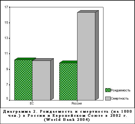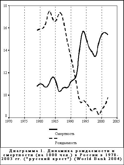Постперестроечный период в России ознаменовался демографической катастрофой, получившей название «русский крест» [2, 3, 9]. С 1987 г. по 1993 г. рождаемость в стране сократилась с 2 до 1,3 ребенка на женщину (или с 17,2 до 9,4 родов на 1000 чел.). С 1986 по 1994 гг. смертность в России выросла с 10,4% (смертей на 1000 чел. в год) до катастрофического и аномального для сколь-нибудь развитых стран уровня 15%. В 1991-1992 гг. смертность сравнялась с рождаемостью, а вскоре и значительно превысила ее. Это означает убыль населения России, не компенсируемую иммиграцией. В Приложении 1 представлена динамика рождаемости и смертности (на 1000 чел.) в России в 1978 – 2003 гг. («русский крест») [9, с. 8 - 9]. По европейским меркам уровень рождаемости в России нельзя назвать беспрецедентно низким, столь же низкая рождаемость наблюдается и во многих развитых странах Запада (да и не только Запада, в Гонконге она, например, 7,1% [родов на 1000 чел. в год], а в современной России - 10,5%). Однако уровень смертности в России (и некоторых других восточноевропейский странах) действительно аномально высок. Подобные показатели смертности (более 15%) встречаются только в пораженных ВИЧ странах Тропической Африки. Высокая смертность является первостепенным источником депопуляции России. Рассмотрим рис. в Приложении 2 [4], где представлены показатели рождаемости и смертности в России и Европейском Союзе в 2002 г. Видно, что уровень рождаемости в обоих случаях приблизительно одинаков. Однако в ЕС в 2002 г. низкая рождаемость компенсировалось столь же низкой смертностью, благодаря чему здесь наблюдался даже некоторый естественный прирост населения. В России же именно катастрофическая смертность населения создает разрыв между рождаемостью и смертностью, который выливается в депопуляцию страны. Общественная дискуссия относительно демографического кризиса в современной России нередко идет в русле обсуждения перспектив приема мигрантов из ближнего и дальнего зарубежья либо мер по увеличению рождаемости. Проблема миграционной политики действительно важна, однако обсуждение ее не должно заменять собой дискуссию о поиске путей выхода России из демографического кризиса. Можно выделить две основные группы гипотез относительно причин столь высокой смертности в нашей стране. 1) Чрезвычайно высокая смертность в России − результат ухудшения уровня жизни после распада Советского Союза: экономический кризис, низкий уровень медицины, неблагоприятная экологическая ситуация, неудовлетворенность жизнью, социальный стресс и т.д. 2) Основными фактором сверхсмертности россиян является высокий уровень потребления алкоголя и других наркотических токсичных веществ. Попробуем проверить эти гипотезы, сопоставив их с имеющимися данными.