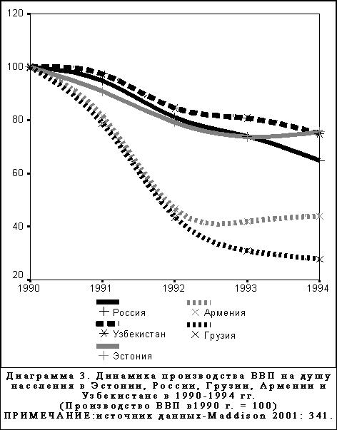 Таблица 1. Динамика производства ВВП на душу населения в Эстонии, России, Грузии, Армении и Узбекистане в 1990-1994 гг. | Год | Производство ВВП на душу населения | | Абсолютные показатели (в международных долларах 1990 г. в паритетах покупательной способности / ППС) | Относительные показатели (1990 = 100) | | Россия | Узбе- кистан | Эсто- ния | Арме- ния | Грузия | Россия | Узбе- кистан | Эсто- ния | Арме- ния | Грузия | | 1990 | 7762 | 4264 | 10733 | 6142 | 7569 | 100 | 100 | 100 | 100 | 100 | | 1991 | 7361 | 4152 | 9757 | 5005 | 5969 | 94,83 | 97,37 | 90,91 | 81,49 | 78,9 | | 1992 | 6289 | 3606 | 8496 | 2858 | 3293 | 81,02 | 84,57 | 79,16 | 46,53 | 43,5 | | 1993 | 5745 | 3443 | 7917 | 2573 | 2335 | 74,01 | 80,75 | 73,76 | 41,89 | 30,8 | | 1994 | 5024 | 3199 | 8123 | 2701 | 2100 | 64,73 | 75,02 | 75,68 | 43,98 | 27,7 |