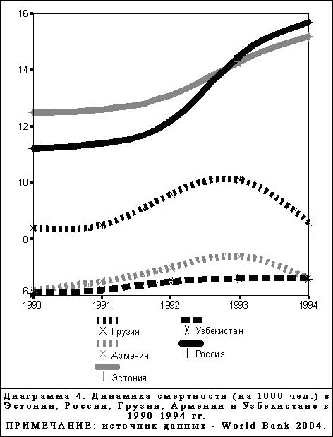 | Год | Смертность | | Абсолютные показатели (на 1000 чел.) | Относительные показатели (1990 = 100) | | Россия | Узбе- кистан | Эсто- ния | Арме- ния | Грузия | Россия | Узбе- кистан | Эсто- ния | Арме- ния | Грузия | | 1990 | 11,2 | 6,1 | 12,5 | 6,2 | 8,4 | 100 | 100 | 100 | 100 | 100 | | 1991 | 11,4 | 6,2 | 12,6 | 6,5 | 8,5 | 101,8 | 101,6 | 100,8 | 104,8 | 101,2 | | 1992 | 12,2 | 6,5 | 13,1 | 7,0 | 9,6 | 108,9 | 106,6 | 104,8 | 112,9 | 114,3 | | 1993 | 14,5 | 6,6 | 14,3 | 7,4 | 10,1 | 129,5 | 108,2 | 114,4 | 119,4 | 120,2 | | 1994 | 15,7 | 6,6 | 15,2 | 6,6 | 8,6 | 140,2 | 108,2 | 121,6 | 106,5 | 102,4 |