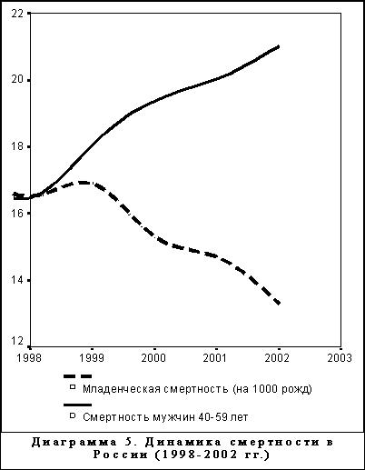 Тенденции смертности не дают оснований для оптимизма. Затяжной, длящийся несколько десятилетий кризис смертности и предопределявшие его факторы создали инерцию, преодолеть которую будет очень сложно. Конечно, экономические и политические реформы постепенно меняют ситуацию и создают новые побуждения и возможности борьбы с ненормально высокой для конца XX в. российской смертностью, позволяют надеяться па рост направляемых на эту борьбу ресурсов и относительную эффективность рыночных механизмов их использования. Но пока реформы идут медленно и болезненно, а их влияние на смертность противоречиво. Поэтому и все имеющиеся прогнозы изменений смертности в России на ближайшие десятилетия весьма пессимистичны. Даже в наиболее благоприятных сценариях, как правило, не предполагается достижения нынешнего уровня западных стран (ожидаемая продолжительность жизни мужчин 72-75 лет, женщин-78-81 год) и через 10-20 лет. Нуждаются в уточнении приоритеты в области здоровья и смертности. Конечно, среди них остается борьба с сердечно-сосудистыми заболеваниями, особенно с ишемической болезнью сердца и нарушениями мозгового кровообращения, служащими одной из главных причин избыточных смертей в возрастах до 70 лет, ибо, как показывает мировой опыт, они вполне могут быть оттеснены к более поздним возрастам. Но должно быть найдено и четко обозначено место и для борьбы с заболеваемостью, инвалидностью и смертностью от внешних причин – несчастных случаев, отравлений, травм и причин насильственного характера, особенно среди мужчин, у которых вызванная этими причинами избыточная смертность даже выше, чем от болезней системы кровообращения. К числу приоритетных следует отнести и меры, направленные на борьбу с выходящими из-под контроля инфекционными заболеваниями, такими, как туберкулез или сифилис, а также СПИД. С точки зрения смертности, влияние этих заболеваний пока невелико, однако их влияние на здоровье населения и их способность к быстрому распространению требуют безотлагательных и решительных мер. К числу главных приоритетов следует отнести разработку и реализацию комплекса мер по резкому улучшению здоровья и сохранению жизни рождающихся детей.