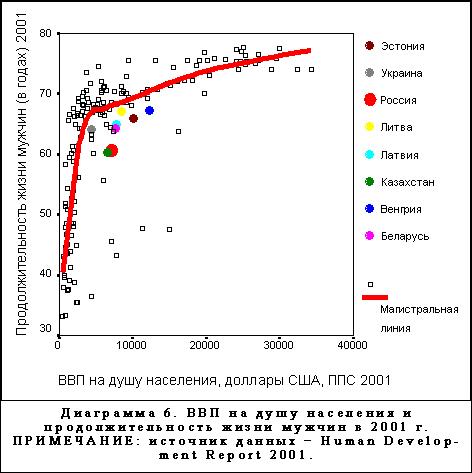 В Приложении 6 [12, с. 26 - 28] представлено распределение стран мира по двум следующим показателям в 2001 г.: ВВП на душу населения и продолжительность жизни мужчин (группы, наиболее пострадавший от кризиса сверхсмертности в России). На диаграмме представлена общемировая картина на 2001 г. (каждый квадратик представляет собой ту или иную страну); усредненная линия представляет собой «магистральную дорогу», по которой в ходе модернизации более или менее сходным образом проходят все регионы мира. Мы видим три основных зоны, представляющих собой три этапа развития. Большую часть своей истории человечество провело в первой зоне крайне низкой продолжительности жизни (и мужчин, и женщин) и крайне низкого производства ВВП на душу населения. Именно такими были условия жизни, скажем, в России 200 лет тому назад. В настоящее время в этой зоне преобладают наименее развитые африканские страны. На этом этапе (в диапазоне 400-3000 долларов на душу населения) даже небольшой прирост ВВП на душу населения ведет к значительному росту продолжительности жизни. Это достигается за счет ликвидации голода, внедрения дешевых (но эффективных в сопоставлении с традиционными средствами) современных медицинских препаратов, позволяющих радикально снизить младенческую смертность и ликвидировать многие эпидемические заболевания, за счет радикального улучшения санитарно-гигиенических условий и т.д. (Данные процессы обычно обозначаются как «первый эпидемиологический переход»). В результате рост душевого ВВП с 400 до 3000 долларов обычно сопровождается действительно кардинальным ростом средней продолжительности жизни, как мужчин, так и женщин (с менее 30 до почти 70 лет). Однако в диапазоне 3000-10000 долларов корреляция между ростом среднедушевого ВВП и продолжительностью жизни падает почти до нуля. Действительно, средняя продолжительность жизни мужчин в странах, производящих ВВП в размере 3000-4000 долларов на душу населения, составляет, в среднем, около 69 лет, а в странах с производством ВВП в пределах 8000-11000 долларов средняя продолжительность жизни мужчин лишь на год больше - около 70 лет. В Приложении 6 мы видим, что страны Закавказья и Средней Азии, а также Ингушетия и Дагестан не являются аномальными. Существуют десятки стран со значительно меньшим ВВП на душу населения, чем в России и значительно более благоприятной ситуацией со смертностью и продолжительностью жизни. В самых богатых странах мира (с производством ВВП на душу населения в размере более 25000 долларов) средняя продолжительность жизни мужчин все-таки заметно выше - 75,6 лет. Но достигается эта прибавка за счет инвестирования многих сотен миллиардов долларов в современное дорогостоящее здравоохранение (так называемый «второй эпидемиологический переход»): оснащение больниц высокотехнологичным оборудованием, строительство десятков тысяч спортивно-оздоровительных комплексов и бассейнов, радикальное улучшение качества питания и т.п. На этом этапе каждый дополнительный год человеческой жизни обходится в сотни раз дороже, чем это наблюдалось во время первого эпидемиологического перехода. Обратим внимание, что экономическое движение России, Эстонии и других европейских стран бывшего Советского Союза после 1990 г. происходило именно в диапазоне ВВП на душу населения 3000-11000 долларов, то есть как раз в том диапазо