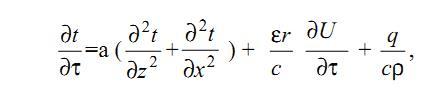 В процессе прогрева металла при атмосферном давлении среды внутри пластины отсутствуют фазовые превращения (критерий парообразования e в уравнении (2) равен нулю) и, как следствие, молярный перенос внутри древесины отсутствует. Тогда, система дифференциальных уравнений (1) – (3) сводится к следующим уравнениям