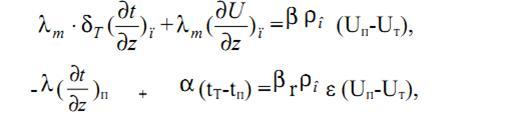 Необходимость рассмотрения этой фазы процесса осушки обусловлена, как отмечалось ранее, наличием объектов находящихся в стадии не только первого, но и второго периода - убывающей скорости сушки [1,3], когда фронт испарения проник внутрь материала по координате z. Во втором периоде сушки удаляется гигроскопическая (связанная) влага, ввиду того, что вся свободная влага с поверхности материала удалена. Таким образом, в условиях пренебрежения бародиффузией [4], движущей силой процесса массоуноса является градиент влагосодержания и температуры. В этом случае совместная система уравнений тепло- и массопереноса записывается в следующем виде: