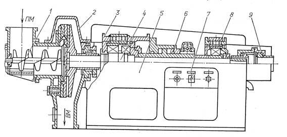 1 — винтовой питатель; 2 — размольная камера; 3 — передняя траверса; 4 — ротор; 5 — станина; 6 — механизм присадки; 7 — система циркуляционной смазки; 8 — задняя траверса; 9 — зубчатая муфта; ЯМ — поступление массы;