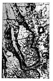 1 — эпителий стенки выводного протока железы; 2 — волосяная воронка; 3 — просвет выводного протока железы; 4 — разрушающиеся клетки концевого отдела железы; 5 — малодифференцированные клетки концевого отдела железы.