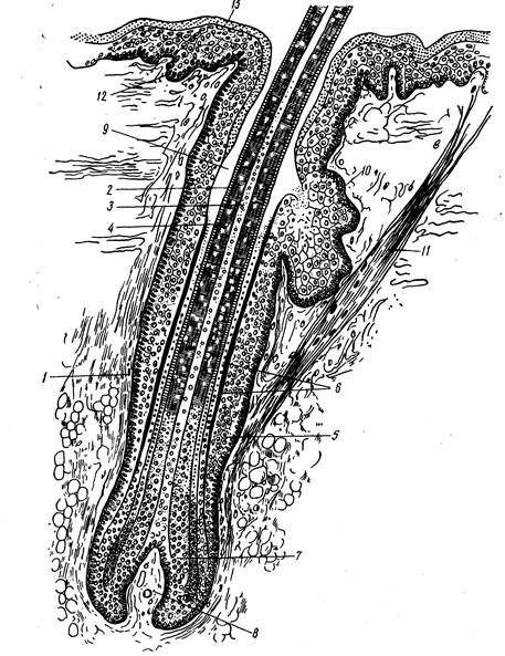 Волос — продукт дифференцировки эпидермиса кожи. Его формирование начинается с локальной репродукции клеток эпидермиса и погружения их в виде тяжа в соединительную ткань дермы. Интенсивный процесс пролиферации эпителия коррелирует с активизацией смежных участков соединительной ткани дермы и ее кровоснабжения. Глубокий конец эпителиальной закладки волоса утолщается в виде колбы. Окружающая ее соединительная ткань формирует волосяную сумку и волосяной сосочек, погружающийся в расширенный конец эпителиального тяжа. Формируется волосяная луковица. Клетки центральной части эпителия луковицы, размножаясь, образуют ткань волоса — его мозговое и корковое вещество и кутикулу. Смежная, периферическая, зона клеток луковицы продуцирует клетки внутреннего корневого влагалища волоса. Растущий от луковицы волос продвигается по каналу в центре эпителиальной закладки, образовавшемуся в связи с ороговением и последующим отторжением клеток ее центральной зоны. Наружные, неороговевающие слои эпителиальной закладки волоса образуют наружное корневое влагалище, которое непосредственно контактирует с соединительнотканной волосяной сумкой.