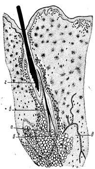а — волосяной сосочек; б — волосяная луковица; в — новый волос; г — старый волос; д — нервные волокна.