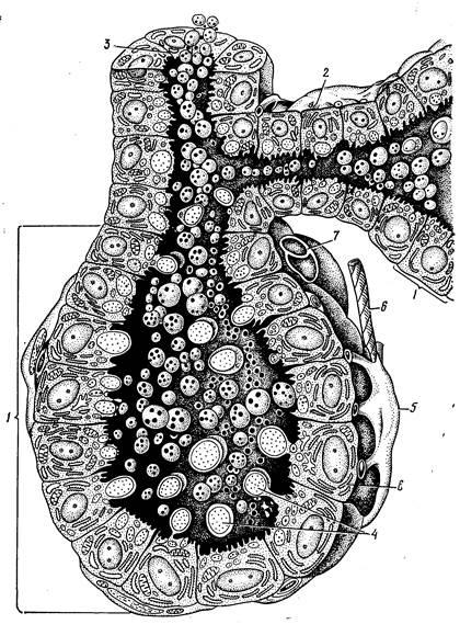 Непосредственно на базальной мембране ацинуса железы лежит слой мелких камбиальных клеток. В них различают округлые или овальные ядра и характерные для цитоплазмы органеллы. В цитоплазме выявляют одиночные или собранные в пучки тонофибриллы. По мере размножения камбиальные клетки дифференцируются и смещаются в центральную зону концевого отдела. Они при этом увеличиваются в размерах. Их ядра сморщиваются и распадаются. В цитоплазме появляются жировые включения. Постепенно смещаясь к выводному протоку, клетки железы перерождаются и, распадаясь, образуют секрет.