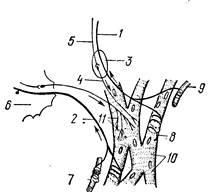 постганглионарное волокно; 5 — преганглионарное волокно; б — звездчатый симпатический узел; 7 — механорецепторы; 8 —