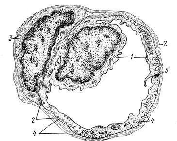 пиноцитозные микропузырьки; 5 — зона контакта между эндотелиальными клетками (рис. Козлова).