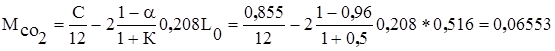 М2 = МСО2 + МСО + МН2О + МН2 + МN2 = C/12 + H/2 + 0,79αL0 = 0,0655 + 0,0057 + 0,0696 + 0,0029 + 0,3923 = 0,5361 кмоль пр.сг/кг топл.