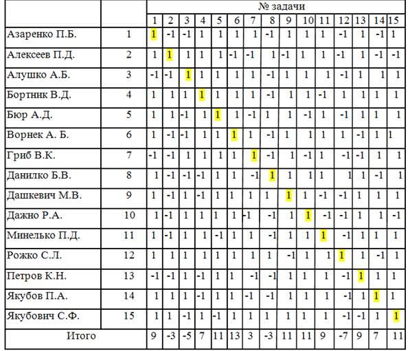 Военнослужащим, имеющим, по мнению испытуемого, ярко выраженные те или иные математические способности в решении одной из 15 задач, в соответствующие клетки матрицы ставилась оценка «+1», а военнослужащим, которых испытуемый наделял отсутствием математических способностей, ставилась оценка «-1» Данные самооценки вносились в специальную графу.