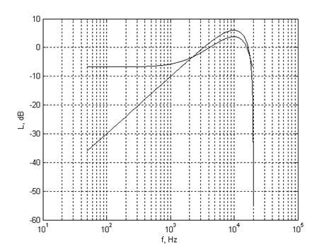 Частотная характеристика осевой чувствительности микрофона – приёмника градиента давления, вычисленная для а = 0.017 м и расстояний r = 0.02 м (кривая 1) и r = 10 м (кривая 2).