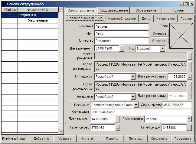 – Фамилия, имя, отчество, дата и место рождения, пол, адрес регистрации и фактический адрес местожительства, сведения о документе, удостоверяющем личность, предусмотрена возможность вставки фотографии работника; Адрес работника возможно вводить как с использованием классификатор адресов, так и вручную. Налогообложение