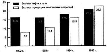 Для современной международной специализации России помимо нефти и газа становится характерной и продукция некоторых других отраслей промышленности, отличающихся, как правило, низкой технологичностью и экологичностью. В их числе — черная и цветная металлургия, базовая химия, целлюлозно-бумажная промышленность. Совокупная доля этих отраслей в российском экспорте за 1992-1996 гг. выросла в 2 раза. При этом стоимость экспорта неэкологичных отраслей промышленности выше, чем совокупная стоимость вывоза нефти и газа. (рис.1). Рис. 1. Тенденции экспортной специализации (млрд. долл.)
