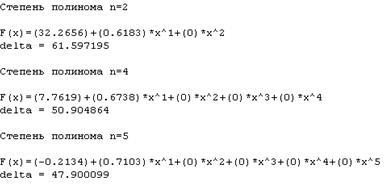 Подберем полиномы второй, четвертой и пятой степени, в качестве аппроксимирующей функции. Для этих целей служат встроенные функции regress